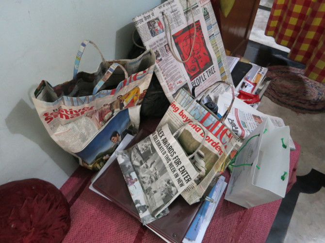 Innovation in action: Bags Pradeep folded out of newspaper. They use an ingenious weight bearing strategy.