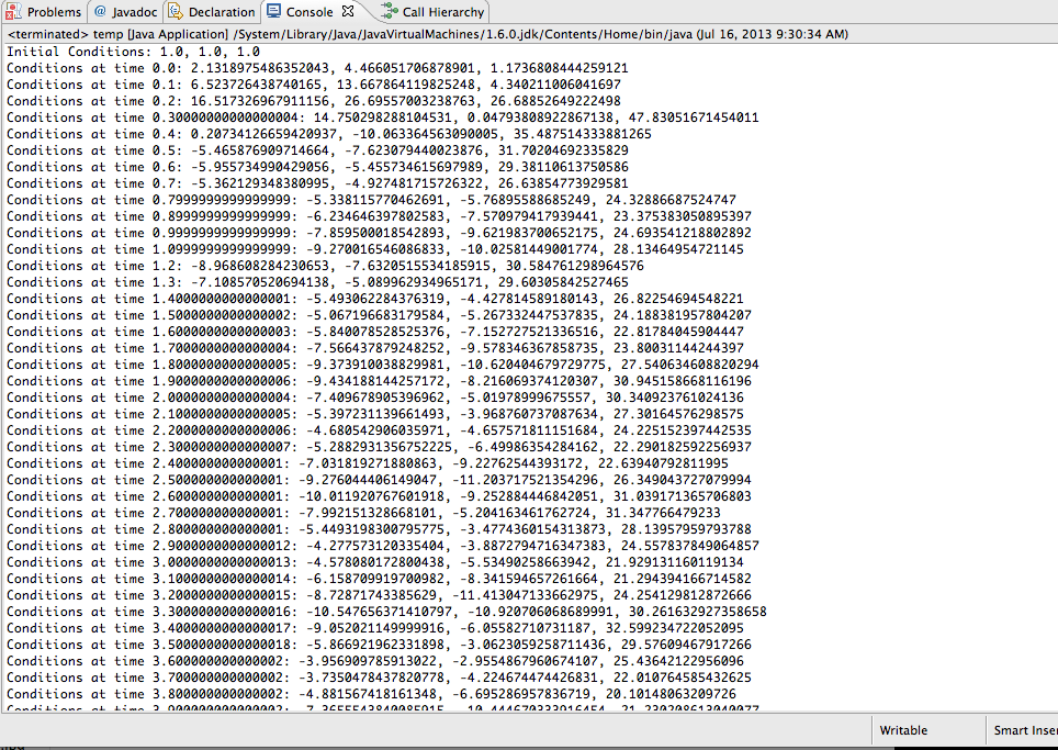 double[] xyz = new double[] { 1.0, 1.0, 1.0 };Now we are all set up to actually use our differential equations (finally! :). The function that we want for this is the integrate() function from our integrator. This function takes in 5 arguments: the implementation of the FirstOrderDifferentialEquations class, the starting time of our integration, an array with the starting values for our differential equations, the ending time of our integration, and the array that the starting values for our differential equations should be recorded in. For this example we are simply going to print out the values for 200 time steps of 0.1 to show that you can access these values.